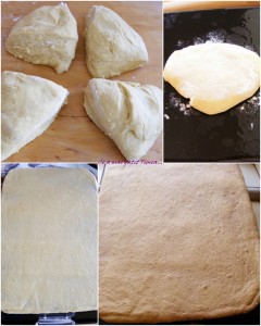 Impartim aluatul in 4 parti egale. Ungem dosul unei tavi cu putin ulei, asezam aluatul si il intindem cu sucitorul.