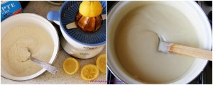 Intr-o cratita punem cele 10 linguri de faina, 10 linguri zahar, zeama de la lamai, si adaugam treptat laptele rece amestecand sa nu se formeze cocoloase. Punem vasul pe foc mic si amestecam pana se ingroasa ca o budinca. Luam de pe foc si lasam sa se raceasca usor. Adaugam untul si mixam sa se omogenizeze.