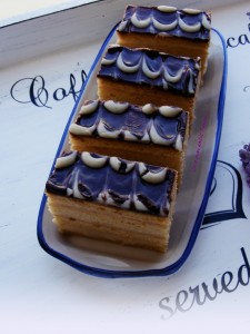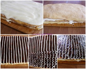 Glazura: topim pe baie de aburi ciocolata neagra impreuna cu frisca lichida si o turnam peste ultima foaie niveland cu un cutit. Pregatim la fel si glazura alba pe care o punem intr-o punguta, o gaurim la una din capete si trasam peste glazura neagra dungi. Cu o scobitoare tragem de la un capat la altul peste glazura alba (vezi poza) .