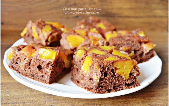 Astazi va aduc inca o prajitura simpla cu fructe de vara dar pe care o puteti face si in alt anotimp mai ales daca puneti fructe la congelator. Am ales varianta cu cacao a blatului si impreuna cu piersicile parfumate a rezultat o prajitura delicioasa.