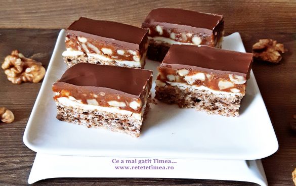 O consider una din cele mai bune prajituri, dupa cele cu crema de vanilie :). Are nuci din plin, caramelul il ador si ciocolata doar completeaza aceasta bunatate de prajitura.