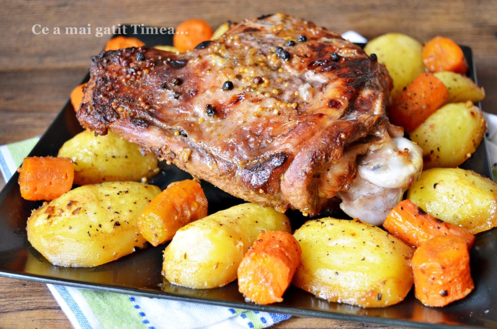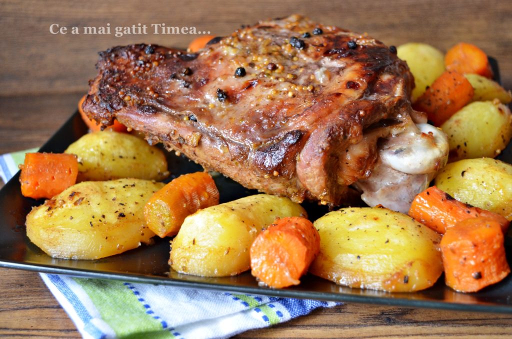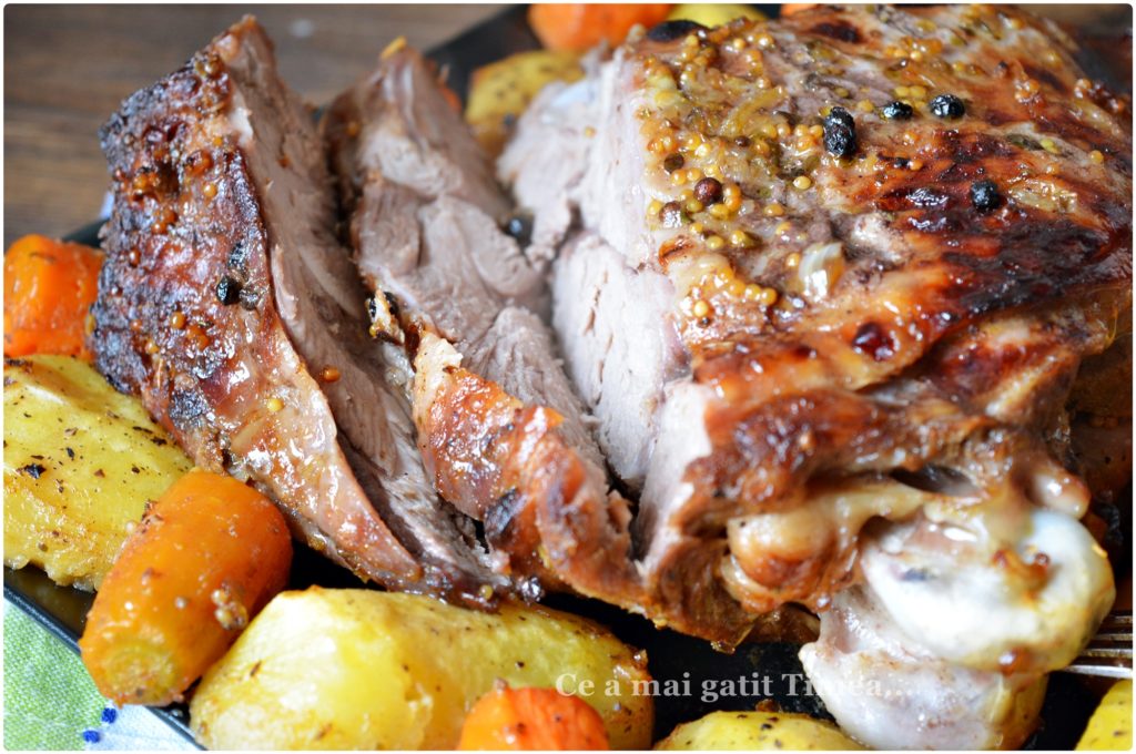 - Dam tava la cuptorul preincalzit la 200 de grade,mai intai cu o folie de Al deasupra ( cam 30 de minute) apoi fara folie inca 30 de minute intorcand pulpa de pe o parte pe alta la interval de 15 minute