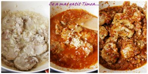 Adaugam ceapa tocata marunt, lasam cateva minute sa se caleasca in sucul lasat de la carne, apoi adaugam doua canite de apa si lasam sa fiarba 15-20 minute.