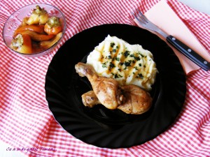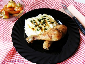Cred ca sunteti de acord cu mine ca aceasta mancare este minunata pentru o zi de sambata sau duminica in familie. Pulpe rumenite, piure de cartofi si salata de ardei copti = un pranz perfect.