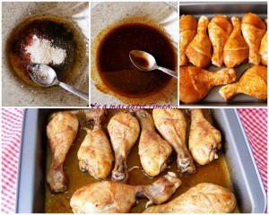 Daca ramane ceva sos il turnam peste pulpe, apoi adaugam apa in tava si dam la cuptorul preincalzit la 190 de grade timp de 45-50 minute. La intervale de 15 minute intoarcem pulpele de pe o parte pe alta.