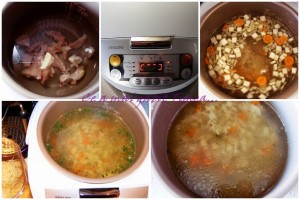 Prima reteta probata a fost una simpla, o supa de pui cu legume. Timpul de pregatire e putin mai lung decat ma asteptam, in rest a iesit o supa delicioasa cu gust puternic de legume. Faptul ca totul fierbe inchis in cuva masinii e un mare plus pentru ca se pastreaza mai bine vitaminele legumelor si in final avem o supa mult mai gustoasa si mai sanatoasa. In plus, cat timp in aparat se prepara supa, pe aragaz pregatesc pot pregati in voie felul doi.