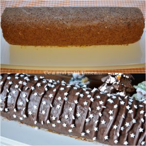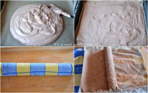 - Scoatem din cuptor si asezam blatul (cu hartie cu tot) intr-un prosop de bucatarie curat si umed. Rulam cu grija si lasam sa se raceasca.
