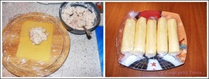 Feliile de cascaval le tinem un pic sub apa fierbinte (ctv secunde pe ambele parti) apoi punem pe un servetel de hartie sa se absoarbe apa. Intindem apoi pe felia de cascaval 2-3 lingurite din compozitia de mai sus si rulam in folie alimentara.
