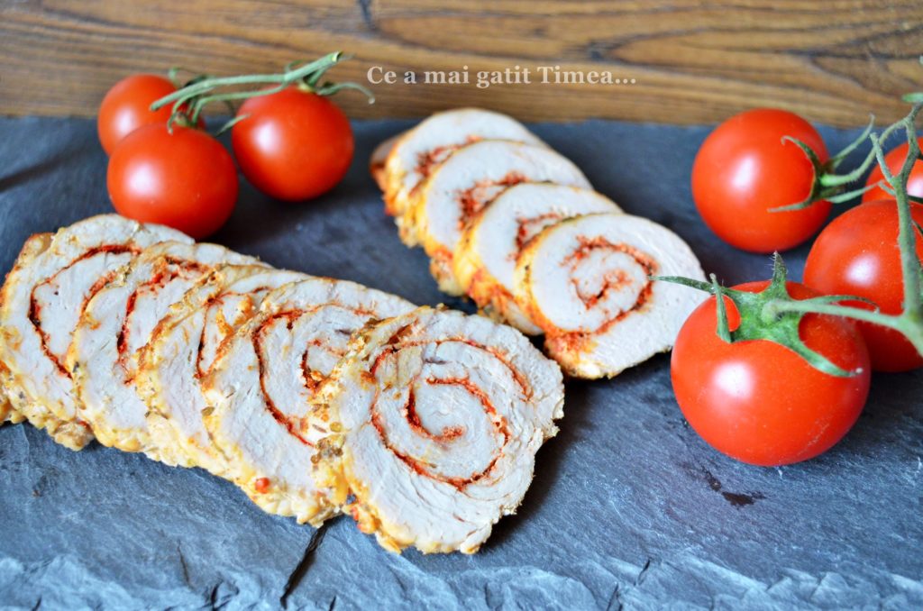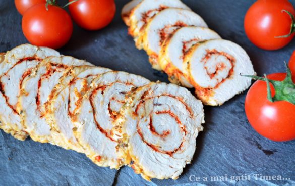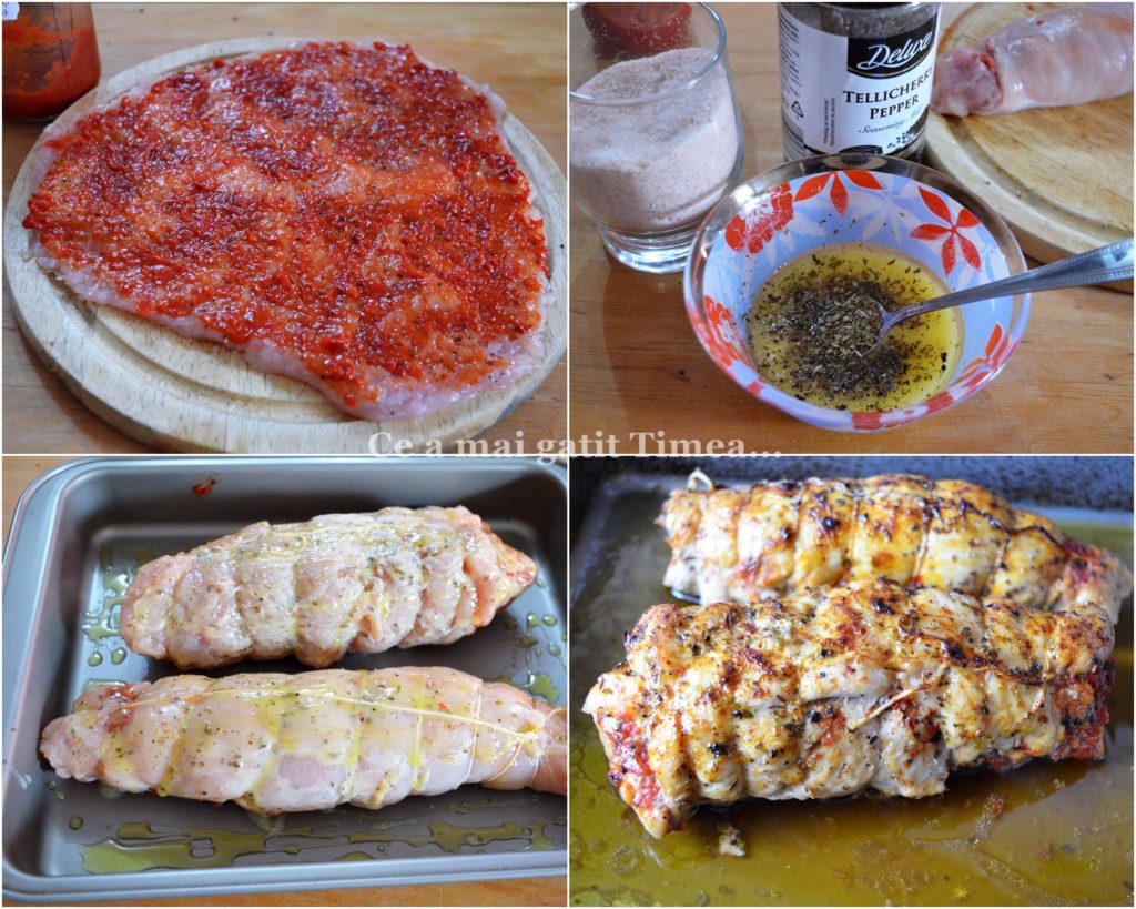 - Taiem pieptul de pui de-a lungul in doua, iar apoi fiecare bucata pe rand, o batem cu ciocanul de batut carne, saram si piperam si le ungem cu cate 3 lingurite din pasta de ardei cu rosii.