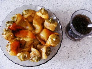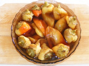 Intr-o cana cu apa amestecam zaharul, sarea, otetul si uleiul. Amestecam si lasam sa se topeasca zaharul apoi turnam dressing-ul peste ardei.