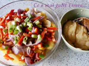 Cartofii spalati bine ii fierbem cu coaja in apa cu putina sare. Lasam sa se raceasca apoi ii curatam si taiem felii intr-un bol. Adaugam ardeiul, ceapa rosie si ceapa verde taiate felii.