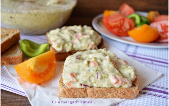 - 3-4 linguri maioneza de casa (va scriu varianta mea: 1 lingurita mustar, 50 ml lapte, 120 ml ulei, sare si piper – facut la mixer vertical la viteza mare)