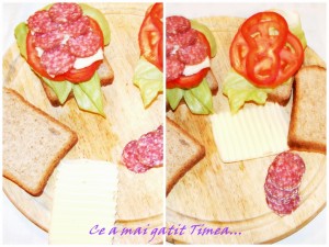 Punem cate o felie de paine peste salam si gata avem un sandvis frumos si bun.