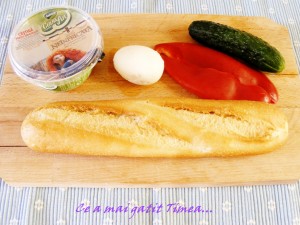Bagheta o taiem in doua si ungem fiecare bucata cu crema de branza.