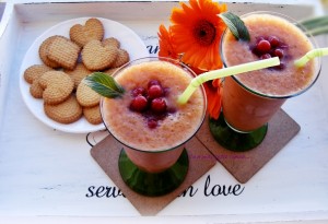 Turnam bautura in pahare, ornam cu frunze de menta si coacaze rosii si servim imediat.
