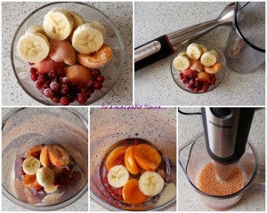 Punem toate fructele in vasul mixerului. Turnam cate putin din apa si cu aparatul pornit pe treapta 3 pasam fructele in 2 reprize de 20-30 secunde.