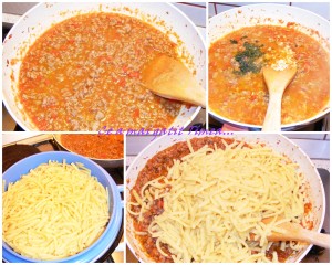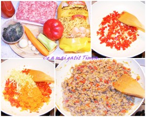 Adaugam apoi carnea tocata si lasam sa se prajeasca usor. Saram si piperam dupa gust.