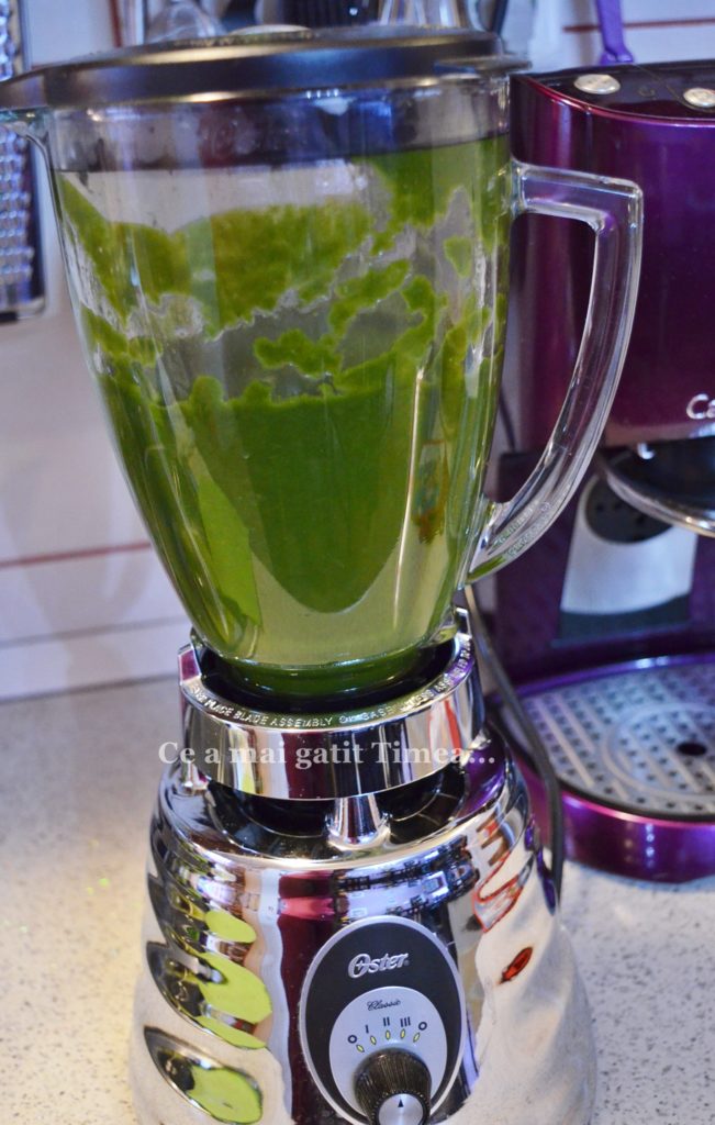 - Spanacul fiert impreuna cu ceapa si usturoiul si cu un polonic din apa in care a fiert le blenduim pana obtinem o crema fina.