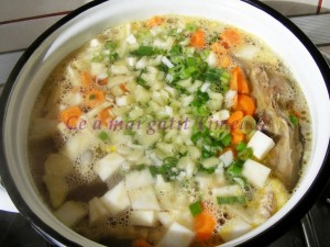 Cand carnea si legumele sunt fierte adaugam pastele si telina verde tocata marunt.