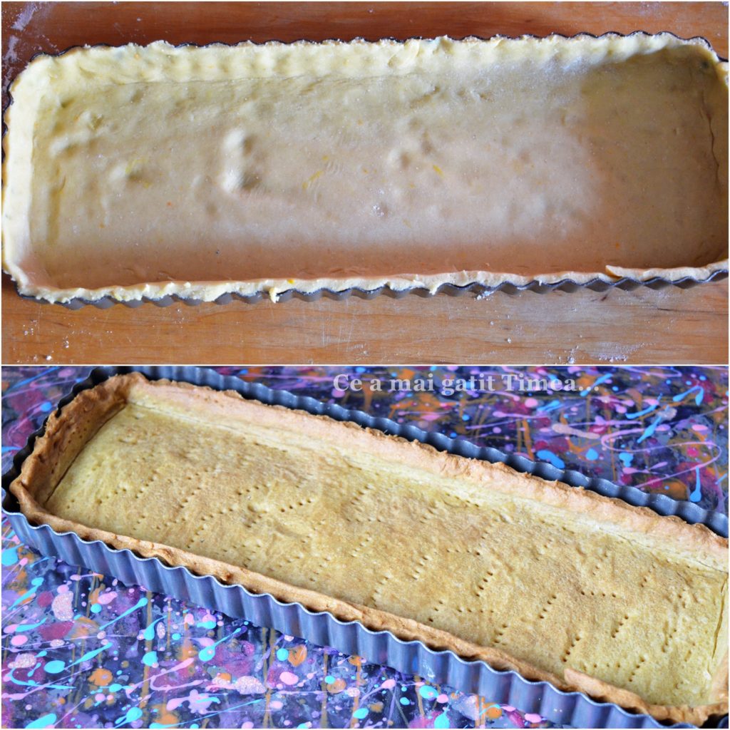 - Punem foaia de aluat in tava unsa cu putin unt, apasam usor cu degetele pe margini si in interior si taiem surplusul de pe margini. Intepam aluatul din loc in loc cu o furculita, asezam peste aluat o foaie de copt in care punem boabe de fasole si dam tava la cuptorul preincalzit la 180 de grade timp de aprox 20 de minute apoi inca 5 minute indepartand foaia de copt cu boabele de fasole.