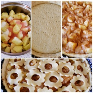 Scoatem tava din cuptor si turnam merele peste foaia de aluat. Presaram zaharul vanilat si scortisoara, iar deasupra punem floricele decupate din aluatul ramas.