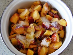 Spalam piersicile, la taiem cubulete, punem zaharul peste ele si le lasam sa stea asa pana pregatim aluatul.