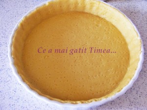 Intindem foaia si o asezam pe fundul tavii si pe margini, intepam aluatul cu o furculita si dam la cuptor timp de 10-15 minute la 170 grade.