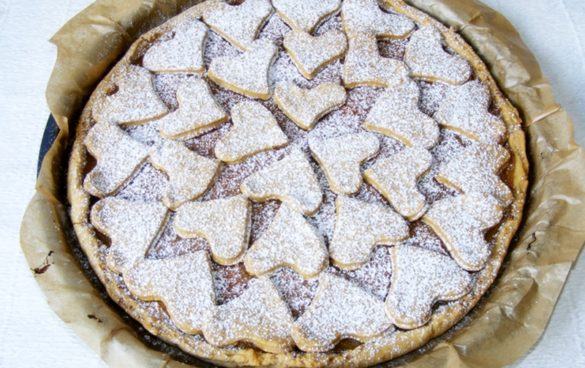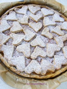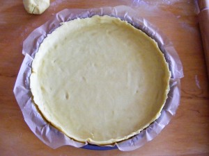 Scoatem din frigider si taiem un sfert din aluat si punem deoparte. Restul asezam pe masa tapetata cu faina intindem o foaie rotunda cu aprox 2 cm mai mare mai mare decat forma rotunda in care urmeaza a fi pusa.