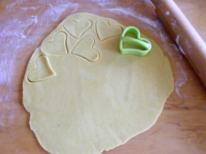 Pregatim intai aluatul: frecam untul cu zaharul si un varf de sare, adaugam oul batut, coaja de portocala si bicarbonatul stins cu sucul de portocala. Adaugam treptat faina amestecand pana incorporam cam jumatate din cantitate, apoi turnam compozitia pe masa de lucru tapetata cu faina si framantam cu mana pana incorporam si restul de faina.