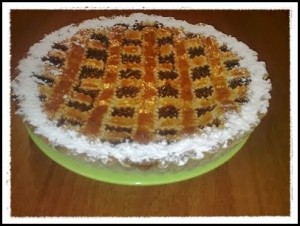 Se imparte aluatul in trei. Din 2/3 din aluat intindem o foaie de aprox 1,5 cm grosime si o asezam in forma pentru tarta. Punem apoi dulceata si o nivelam frumos, iar din restul de aluat se face un grilaj peste dulceata apasand pe margini.
