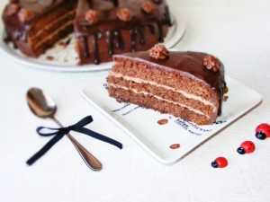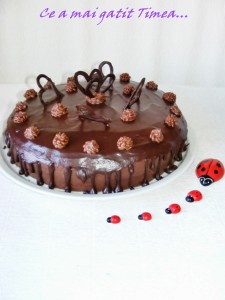 Pentru glazura: topim pe baie de aburi ciocolata amestecata cu frisca lichida si amestecam pana se topeste ciocolata. Lasam sa se raceasca usor apoi turnam peste tort, nivelam si lasam sa curga si pe margini.