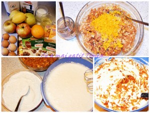 Mai intai spalam si curatam fructele si le dam prin razatoarea mare. Le stoarcem putin de suc si adaugam zaharul vanilat, coaja rasa de la citrice si mixul de condimente si amestecam bine.