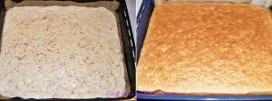 Turnam compozitia in tava mare de la cuptor tapetata cu hartie de copt si dam la cuptorul preincalzit la 175 grade timp de 30 de minute. Scoatem din cuptor si lasam la racit. Eu am facut blatul cu o zi inainte pt a se putea decupa mai bine.
