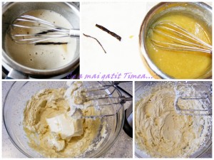 Pregatim crema: amestecam bine ouale cu zaharul pudra, apoi adaugam apa si vanilia despicata in doua. Punem pe baie de aburi si amestecam pana se ingroasa si devine ca o budinca. Luam de pe foc si lasam la racit. Dupa ce s-a racit turnam intr-un bol si mixam adaugand treptat untul.
