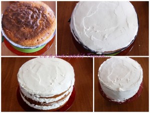 Deasupra urmeaza a treia foaie de blat pe care o insiropam si o ungem cu frisca. Am mai pastrat 2 linguri din frisca pentru margine. Dam la frigider aprox 2-3 ore dupa care scoatem din frigider si cu frisca pastrata ungem tortul de jur imprejur.