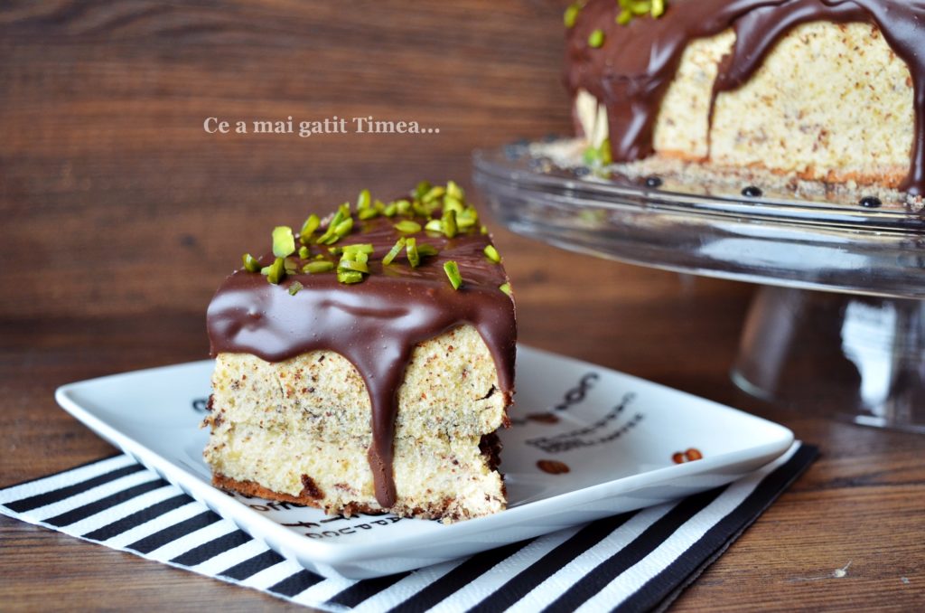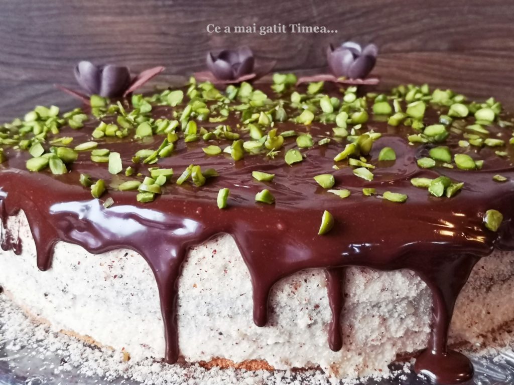 - Il scoatem din frigider, indepartam inelul si ungem de jur imprejur cu crema ramasa. Presaram apoi peste crema de pe margine, migdale macinate.