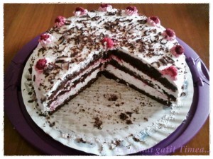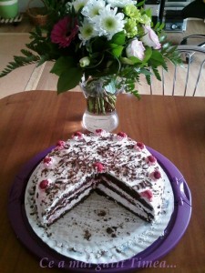 Am pornit sa fac un tort Padurea Neagra dar, ca niciodata m-am trezit ca nu fructele necesare in casa :))… asa ca am improvizat rapid alt tort si nu imi pare rau pt ca a avut succes (chiar daca eu nu sunt prietena cu zmeura 🙂 )