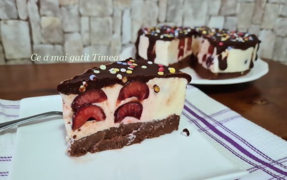 Pentru zilele toride de vara, va recomand acest Tort de biscuiti cu frisca si cirese, un desert usor de facut, fara coacere si foarte racoritor. Daca doriti, puteti inlocui o parte din frisca lichida cu mascarpone.