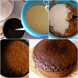 Albusurile le batem spuma cu un varf de sare. Adaugam zaharul si mixam 2-3 minute, apoi adaugam pe rand galbenusurile si uleiul mixand dupa fiecare. Turnam apoi o parte din ciocolata topita amestecand cu o spatula si incorporam o parte din faina amestecata cu praful de copt. Apoi adaugam restul de ciocolata, amestecam si adaugam restul de faina.
