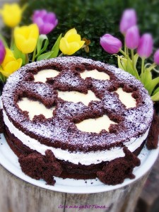 – taiem tortul in trei (foaia din mijloc o sa fie cea decupata si pusa deasupra)