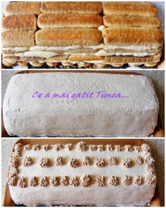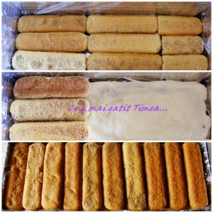 Intr-o farfurie adanca turnam cafeaua indulcita si trecem piscoturile prin cafea si asezam un prim rand pe fundul tavii de-a lungul. Peste piscoturi, punem un strat de crema apoi inca unul de piscoturi insiropate, apoi iar crema si tot asa, in final 4 randuri de piscoturi si 3 de crema. Ultimul rand de piscoturi il punem invers.(vedeti in poze)