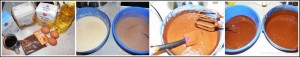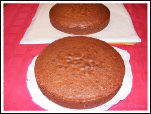 Impartim compozitia in doua vase sau daca aveti doua forme de tort identice le puteti pune direct in forme. Eu am doar o tava rotunda :).