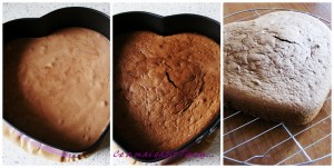 Turnam copozitia intr-o forma de inima (22 cm) tapetata pe fund cu hartie de copt si dam la cuptorul preincalzit la 175 de grade timp de 30 min.