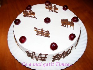 Asezam apoi urmatoarea foaie de blat apasand usor cu degetele si procedam la fel: sirop-jeleu de visine-frigider-frisca. Indepartam inelul de la tava de tort si ornam si marginile cu frisca.