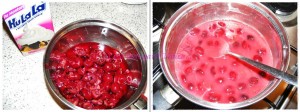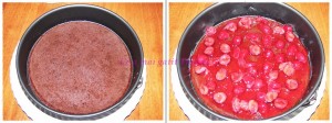 Impartim toate ingredientele in doua vase separate si le preparam pe rand in momentul in care trebuie sa il folosim. Adica mai intai amestecam 200 gr visine cu jumatate plic gelatina, 125 gr apa si 2 linguri zahar si punem pe foc pana incepe sa fiarba. Apoi cand avem nevoie de cealalta jumatate procedam la fel