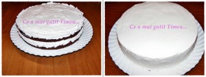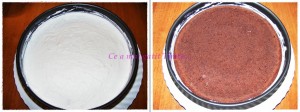 Tapetam o forma rotunda si turnam jumatate din compozitie si dam la cuptorul incins la 175 grade timp de 20-25 minute. La fel procedam si cu cealalta jumatate.