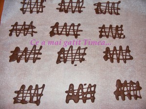 Pentru ornat: topim aprox 50-70 ciocolata pe baie de aburi, o punem intr-o punguta pe care o gaurim la una din capete si pe o foaie de copt desenam ‘gardulete’.