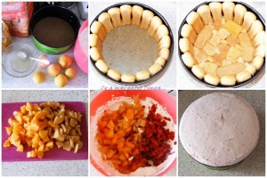 Folosim o tava rotunda mica 17-20 cm. Pe fundul tavii punem hartie de copt, apoi de jur imprejur si pe fundul tavii asezam piscoturi insiropate in sucul de la coptotul de pere.