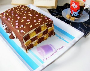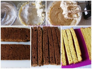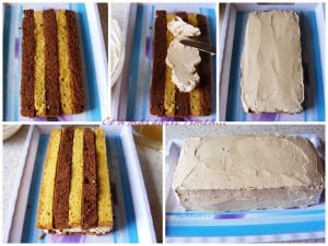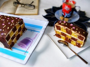 Pe un platou asezam pe rand: fasie neagra – alba – neagra – alba – neagra. Insiropom cu siropul obtinut prin amestecarea ingredientelor in apa calduta apoi punem primul strat de crema. Urmeaza al doilea rand de fasii, iar acum punem alb-negru-alb-negru-alb. La fel insiropam si ungem cu crema. Ultimul rand vine exact ca primul si la fel insiropam si ungem cu crema. Ungem prajitura cu crema deasupra si de jur imprejur apoi dam la frigider timp de 30-40 minute pana se intareste crema.