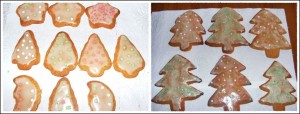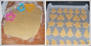 Intindem apoi aluatul pe o plansa cu faina si decupam formele dorite. Foaie trebuie sa fie de 5-6 mm. Atentie! aluatul fiind cu miere se lipeste dar daca puneti faina si manuiti cu grija se pot decupa usor formele. Eu am facut chiar si braduti cu cutitul :). Dam la cuptor timp de 8 -10 min la 190 grade in cuptor preincalzit.